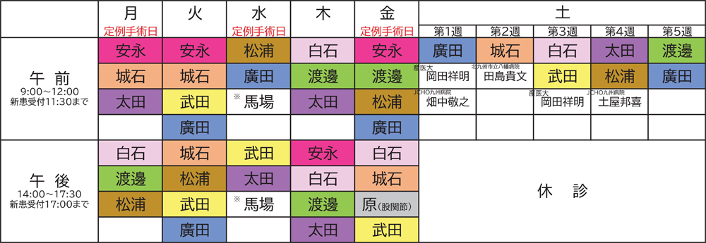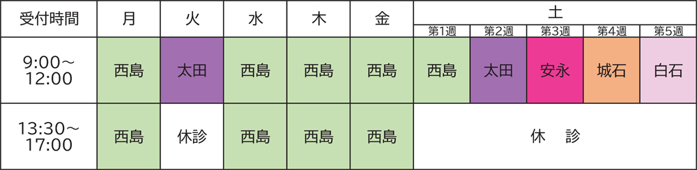 | [新患受付] 9:00~11:30 [再来受付] 9:00~12:00 |